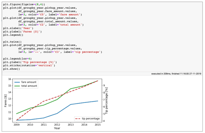 在上面的单元块中,我们执行一个分组操作,然后是 8 个聚合,其中 2 个在虚拟列上。上面的单元块在我的笔记本电脑上执行不到 2 分钟。这相当令人印象深刻,因为我们使用的数据包含超过 10 亿个样本。不管怎样,让我们看看结果。以下是多年来驾驶出租车的费用演变过程: