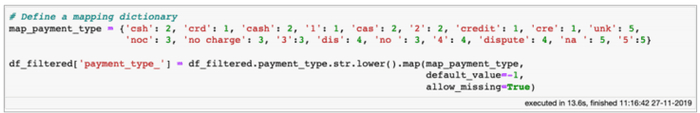1 = credit card payment2 = cash payment3 = no charge4 = dispute5 = Unknown6 =Voided trip因此,我们可以简单地将 payment_type 列中的条目映射为整数: