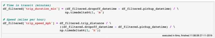 出行距离列中极端离群值的存在是考察出租车出行持续时间和平均速度的动机。这些功能在数据集中不易获得,但计算起来很简单: