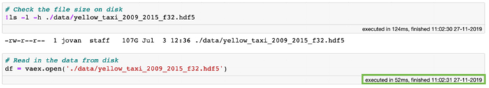 第一步是将数据转换为内存可映射文件格式,如 Apache Arrow、Apache Parquet 或 HDF5。将 CSV 数据转换为 HDF5 的示例可以在这里找到。一旦数据是内存可映射格式,用 Vaex 打开它是即时的(0.052 秒!),尽管磁盘上的数据超过 100GB: