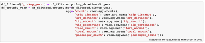 上面代码块最酷的地方是它需要的内存可以忽略不计!它在过滤 Vaex 数据帧时,不会生成数据的副本,相反,它只创建对原始对象的引用,并在其上应用二进制掩码。掩码选择显示哪些行并用于将来的计算。这为我们节省了 100GB 的 RAM。