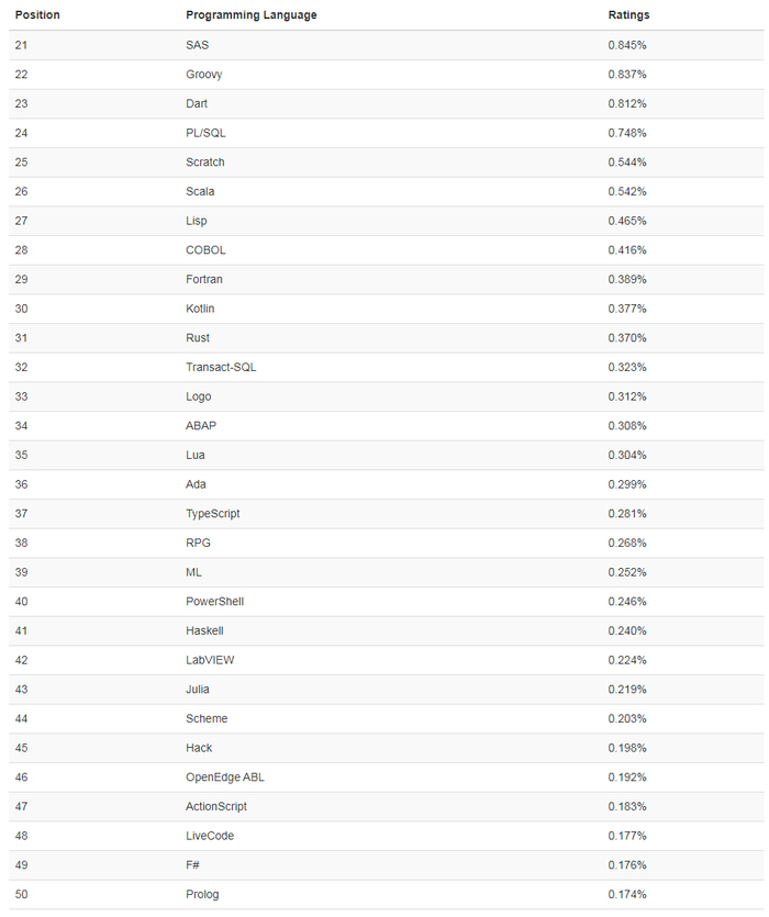Rust 的排名上个月从 34 上升到了 25,并创下历史新高,这个月又下降至 31,可谓是起起落落。虽然排名有所下降,不过它的热度却一直在线,毕竟上周微软还宣布正在开发基于 Rust 的安全编程语言。