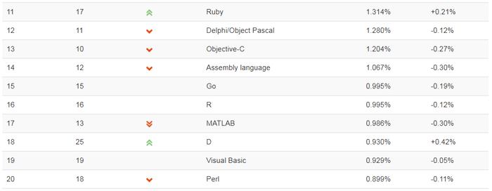 20 名内值得关注的编程语言还有 Go、Perl 和 Groovy。其中 Go 和 Perl 的排名与上个月相比都有了一定的进步,Go 由上个月的 20 升至本月的 15,Perl 由 21 升至 20。Groovy 的排名则出现了意外的下跌,由 14 下降至 22。