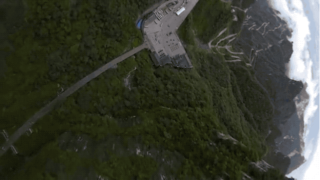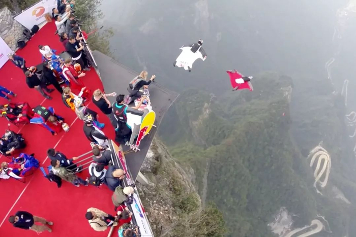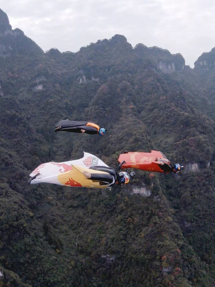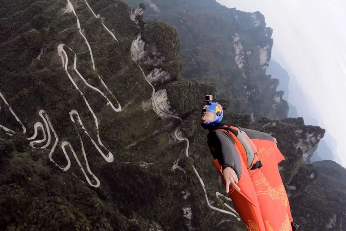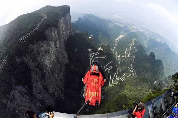 翼装飞行对于场地的要求其实比较严格的,需要找到相对高度600米以上的山,垂直的悬崖至少有300米,国内最适合的就是张家界天门山,是一个很有挑战性、很高级的场地,全世界很顶尖的翼装飞行员都特别向往这,认为这是全世界来讲翼装飞行的一个圣地。最早是一个美国翼装飞行员,他的朋友来中国旅游时拍了一张天门山天门洞的照片发给他,告诉他世界上有个这么样独一无二的地形,他看了照片以后就觉得,哇,这是一个可以挑战翼装飞行的地方。