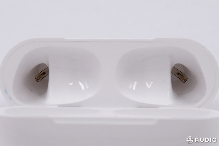 充电盒耳机座仓内部特写,座仓底部有充电弹片。