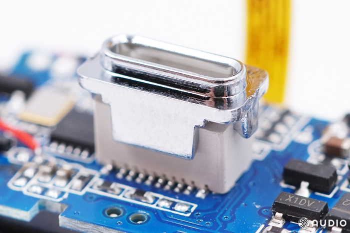 充电盒主板的Lightning充电母座特写,座子外周有一圈塑料仿金属的加固结构。