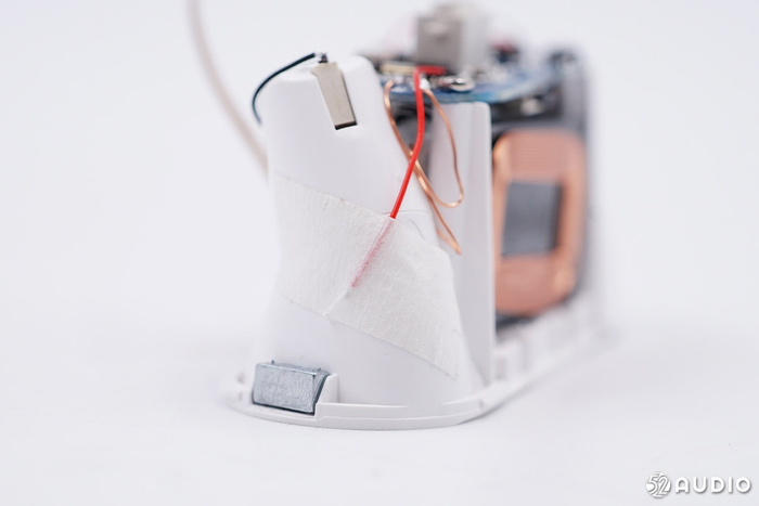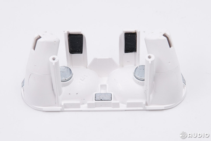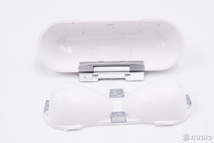 充电盒中框结构特写。中框内壁贴有耳机定位磁铁及充电盒闭合磁铁。