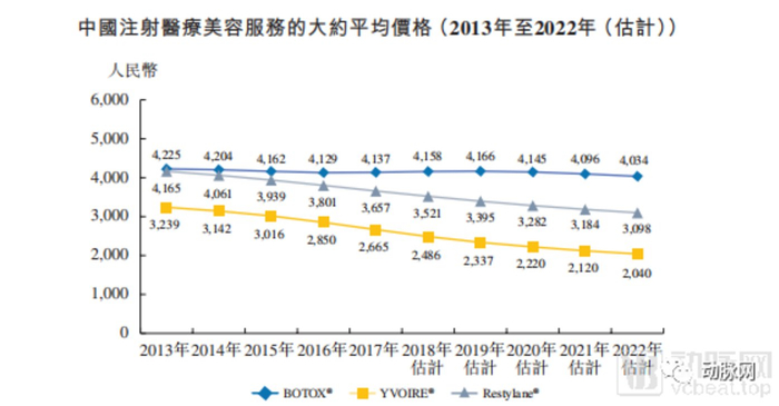 就注射透明质酸而言,注射瑞蓝(Restylane)及注射伊婉(YVOIRE)的大约平均价格分别由2013年的4165元及3239元降至2017年的3657元及2665元,主要是由于市场竞争激烈。