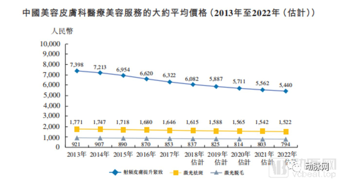 射频皮肤提升紧致、激光祛斑及激光脱毛的大约平均价格分别由2013年的7398元、1771元及921元降至2017年的6322元、1646 元及853元,主要是由于市场竞争激烈。