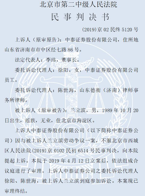 综上,中泰证券的上诉请求不能成立,应予驳回;二审法院驳回中泰证券上诉,维持原判。