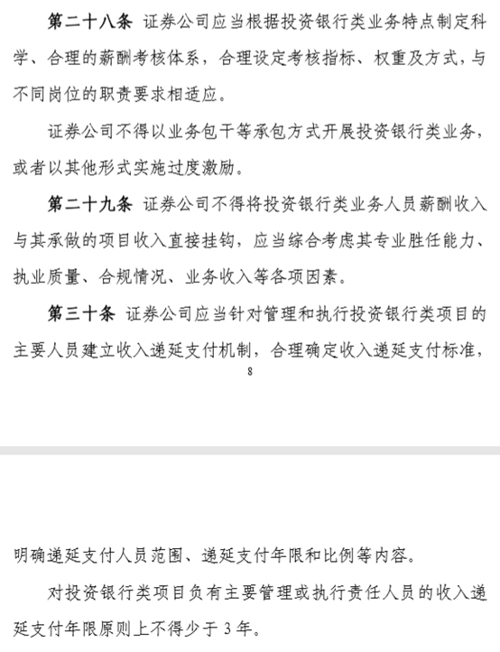 此外,《指引》指出,证券公司应当建立业务人员奖金递延支付机制,不得对奖金实行一次性发放。奖金递延发放年限原则上不得少于3年。投资银行类项目存续期不满3年的,可以根据实际存续期对奖金递延发放年限适当调整。与此同时,内部控制人员的薪酬收入也不得与单个投资银行类项目收入挂钩。