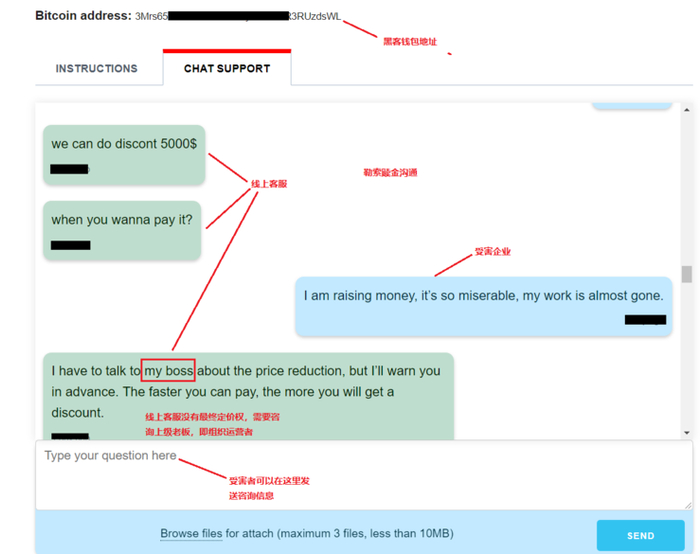 而当黑客有钱了,他们还给自己找了线上保镖,专门负责谈判,24 小时在线。当然,线上客服没有最终定价权,最终赎金价格由上级老板拍板,即Sodinokibi勒索病毒的组织运营者。