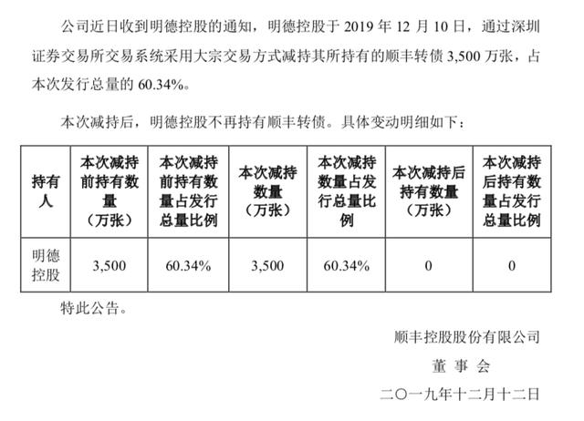 12月12日,顺丰控股发布关于控股股东减持公司可转债的公告,公告显示公司控股股东明德控股12月10日通过大宗交易方式,减持顺丰转债3500万张,占发行总量的60.34%。减持后,明德控股不再持有顺丰转债。