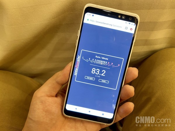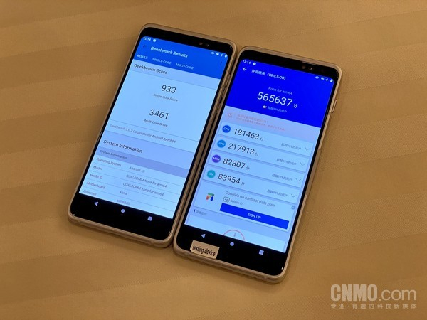如图所示,是小编亲手用三台测试机跑出的分数,总分皆在56万5以上。查看单项分数,CPU单项得分18万1~18万2,GPU得分21万~22万,MEM8万1~8万2,UX得分8万1~8万3。