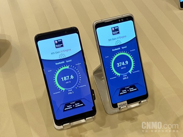 在对比的测试中我们可以看到,融合了第五代AIE人工智能引擎的高通骁龙865移动平台已经成功的达到了上一代第四代人工智能引擎的2倍。