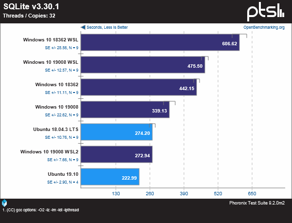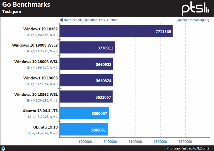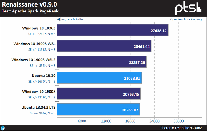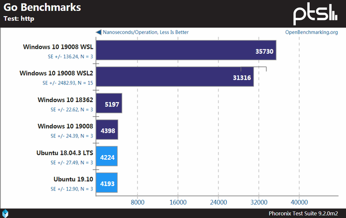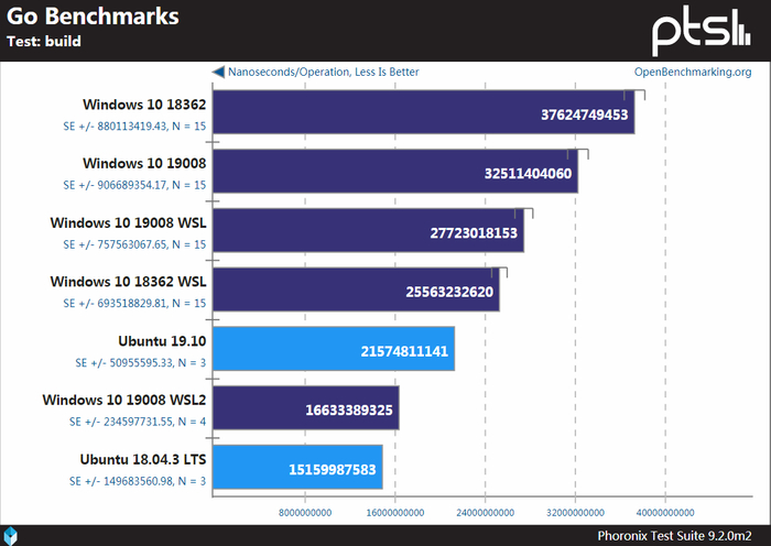 Windows 10 Build 19008 的总体性能要比 Build 18362 版本好,而 WSL 的性能并没有太大变化
