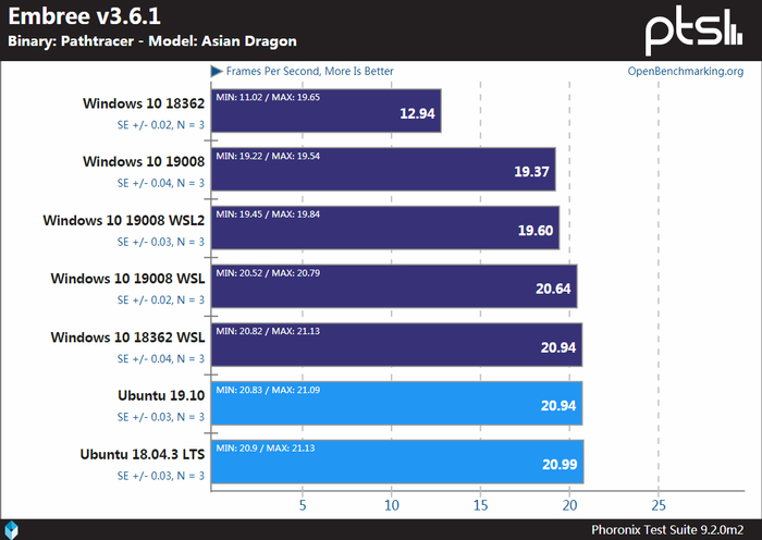 这里使用英特尔 Embree 测试的数据也很有趣,可以看到,在使用官方 Windows 二进制文件的情况下,Windows 10 19008 的性能要比 18362 的更好,WSL1 的性能也比 WSL2 好,不过它们都要比 Ubuntu 逊色一筹。