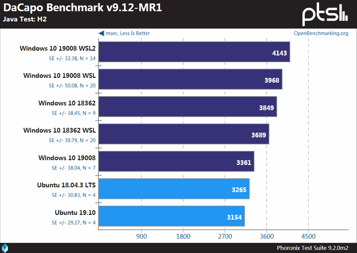 上面的数据显示,在使用相同 OpenJDK 版本的条件下,Windows 10 19008 似乎也比 Windows 10 18362 提供了更好的 Java 性能。而对于 WSL,结果好坏参半。