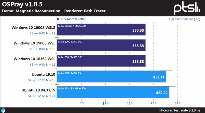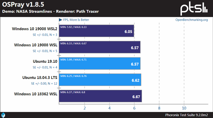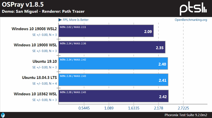 上面的数据是使用英特尔 OSpray 渲染器进行测试的结果,可以看到 WSL1 比 WSL2 快。