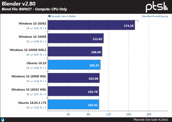 使用 Blender 进行测试时,WSL/WSL2 可与 Linux 的性能相媲美,而 Windows 10 18362 的表现则稍有落后。