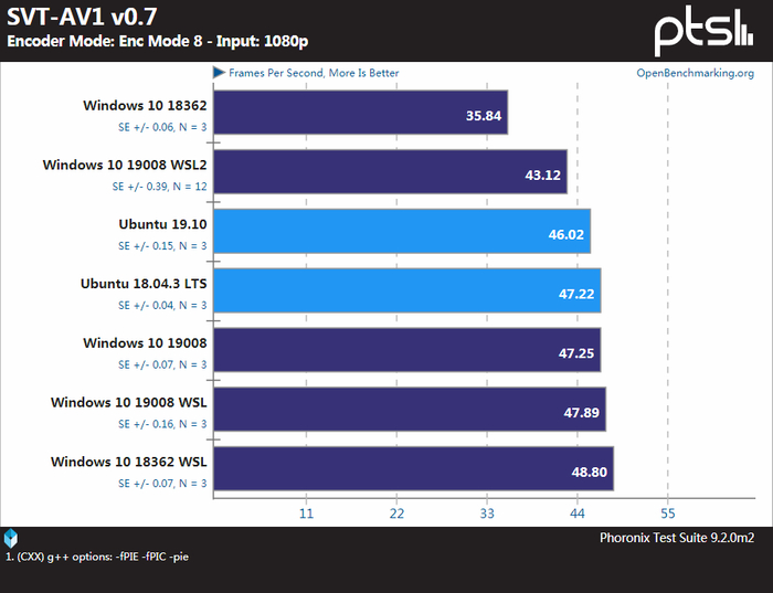 这里使用了英特尔 SVT 视频编码器进行测试,可以看到,属于 Windows 10 Insider 预览版的 Windows 10 19008 表现不错,和 Ubuntu、WSL/WSL2 不相上下。