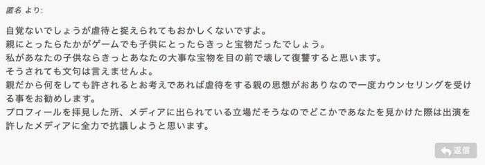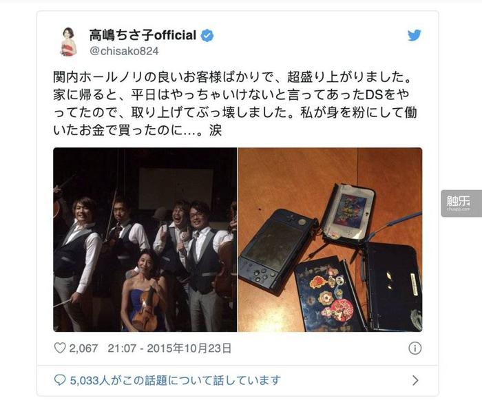 无独有偶,因为砸了孩子的游戏机而被网友称为“毒亲”的家长不止七里信一一个。2015年,小提琴家高岛千子因为孩子不听话玩游戏,砸了孩子的DS,还把图片发上推特,同样遭到了大量指责。