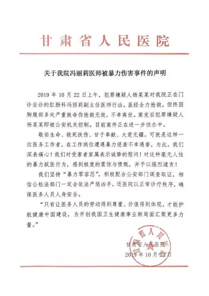 2019年10月22日上午,甘肃省人民医院门诊三楼的7号诊室里,肛肠科副主任医师冯丽莉正在给一位患者做检查。突然,一名男子闯入诊室,朝着冯丽莉连砍数刀,导致其胸腹部多处严重致命伤,最终不幸身亡,年仅42岁。经初步调查,犯罪嫌疑人杨某某因患直肠癌,曾在医院就诊手术,冯丽莉是他的主治医师。