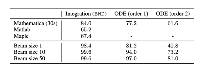 这个表格显示了包含 500 个方程的测试集上,本文模型与Mathematica、Matlab、Maple三大著名数学软件的比较。对于Mathematica,假设了当时间超过30s而未获得解则认为失败(更多时延的对比可见论文原文附录)。对于给定的方程式,本文的模型通常会在不到 1 秒的时间里找到解决方案。