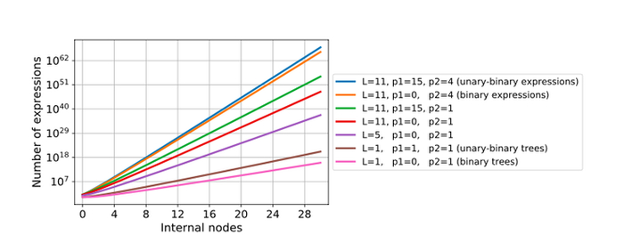 当有了合适的表示之后,另一个重要的事情便是如何生成恰当的数据集。作者采用生成随机表达式的算法(具体这里不再赘述),如果用p1表示一元运算子(例如cos、sin、exp、log等)的集合,p2表示二元运算子(例如+、-、×、÷等)的集合,L表示变量、常数、整数的集合,n 为一棵树的内部节点个数(因此也是表达式中运算子的个数)。可以计算,表达式的个数与n之间有如下关系: