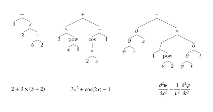 运算符和函数(例如cos、pow等)为内部节点,数字、常数和变量为叶。可以看出这里每一个数学公式都对应唯一一个树结构。