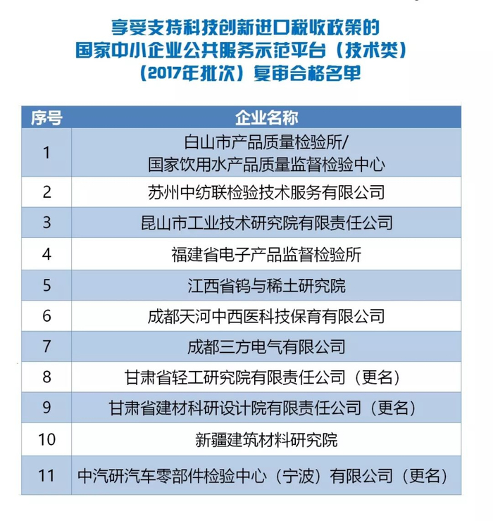 2.享受支持科技创新进口税收政策的国家中小企业公共服务示范平台(技术类)(2017年批次)复审合格名单