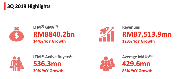 11 月 20 日晚间,拼多多公布了 2019 年第三季度财报。财报显示,过去的 12 个月,平台年活跃买家数达 5.363 亿,较去年同期净增 1.508 亿,创上市以来最大单季增长。
