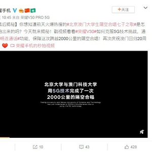 刚刚,我们看到@荣耀手机 官方微博曝光了#北京澳门大学生隔空合唱七子之歌# “幕后揭秘”视频,画面中我们看到了#荣耀V30#是如何克服5G技术挑战,并通过#畅连通话#功能,保障这次跨越2000公里的隔空合唱的细节。