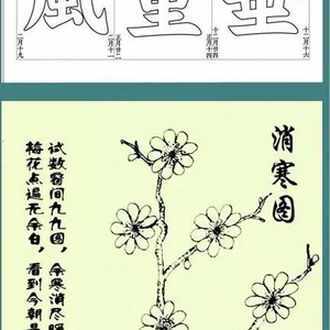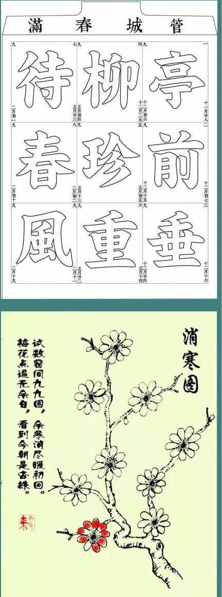 消寒图的形式很多。民间最简单、最常见的是在一张16开的白纸上画九格,再以铜笔帽蘸上印油,每格印上九个圆圈。稍讲究的则在每格印上或画上九个车轱辘钱。圈或“钱”旁注上日子,以资辨认。