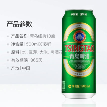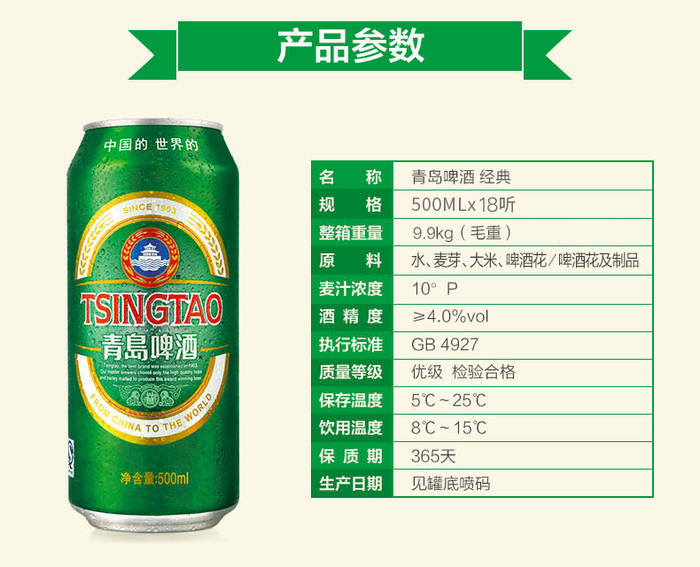 青岛最经典也是最畅销的一款,选用优质大米、麦芽、上等啤酒花和软硬适度、洁净甘美的崂山矿泉水为原料酿制而成。原麦汁浓度为10°P,酒精含量4.0%。酒液清澈透明、呈淡黄色,泡沫细腻洁白、麦香浓郁,酒体沉厚柔和,香醇爽口。