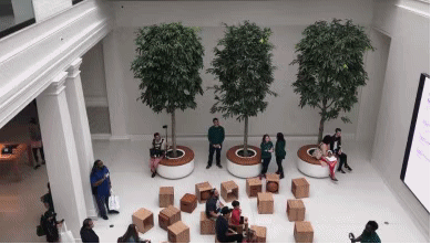 在这家苹果零售店里,还安排了授课和学习空间,室内设置了两层楼高的挑空,顶部为自然采光,配合两侧绿植,形成室内中庭效果,这里正好作为讲座空间。正方形的木质培训椅错落排放,公众可以向苹果零售团队的知识中心预约课程。