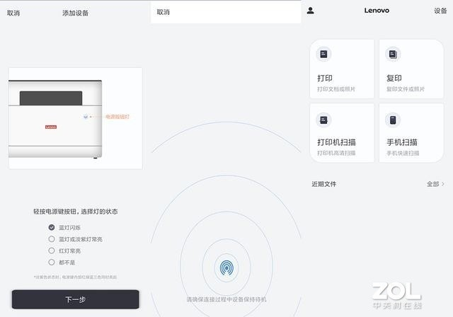 ▼参照【联想打印】APP的向导选择打印机指示灯的状态,手机自动搜索到打印机,连接完成后就可以实现移动办公了。