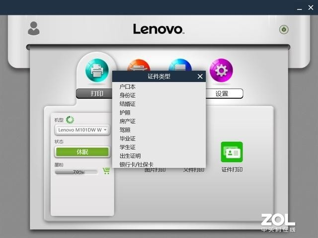 ▼除了图片打印和文件打印,还有一项证件打印,可选的证件类型还是非常多的。