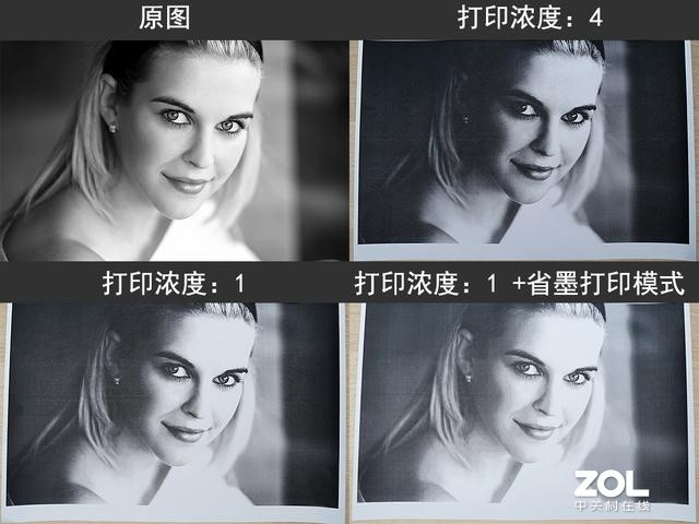 ▼以下四张图片都是选择最高打印质量。默认打印浓度为4(最高浓度为7),打印出的图片对比度高;打印浓度为1,要好的多,更接近原图;而再选择省墨打印模式,图片会再淡一些,不过过渡部分的效果还原程度并不是很好。