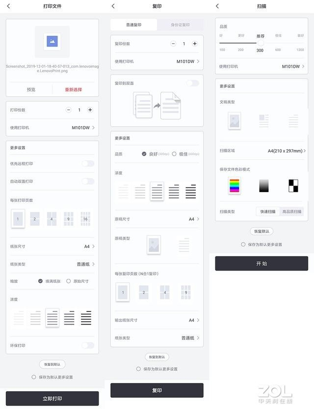 ▼APP端中的打印,复印和扫描选项基本和PC端一样,如果所需资料是在手机上,完全可以用手机实现对M101DW的操作,从而摆脱掉PC端。