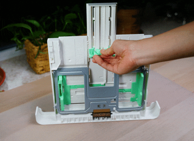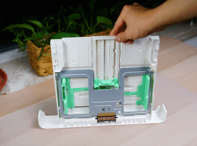 ▼进纸盒的提供了不同尺寸纸张的刻度,移动部件可以用来固定住不同尺寸的纸,不过最大也只能支持到A4的纸张。