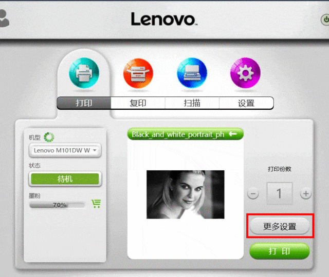 ▼M101DW是台黑白打印机,打印图片当然不是它的强项,这里试一下,并不是日常的主要应用。选好图片后在更多设置里有很多选项可以调节,打印质量的最大可达到1200*600,还有打印浓度的调节,另外还有一项省墨打印模式。
