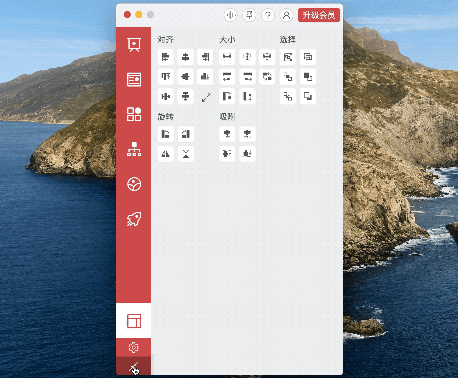 左侧选项卡的案例库、主题库、色彩库、图示库、图片库、插图库一应俱全,却少了 Windows 版中的智能图表和图标库。左侧下方是非常好用的设计工具、偏好设置和「收起/展开」按钮。