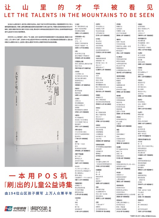 历时半年,从上海到厦门、深圳、广州、成都、北京六座城市的中国银联诗歌POS机全国巡展,跨越6000多公里,上万人参与“众筹”。活动中194名山区孩子所作的200首诗歌,由人民日报出版社整理出版为儿童公益诗集《大山里的小诗人》,让更多人看见山里孩子的才华。本版所刊诗文均出自该诗集。