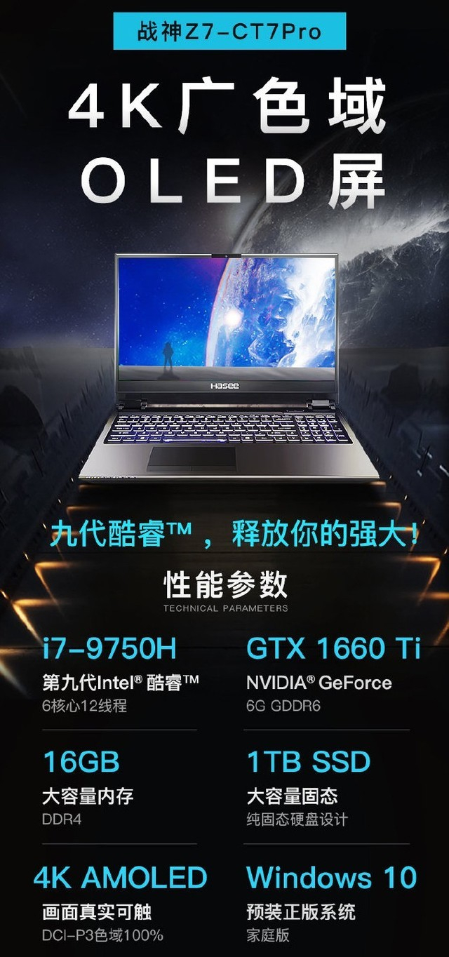 神舟战神Z7-CT7PRO 酷睿九代处理器,6G独显,4K广色域OLED屏,背光键盘