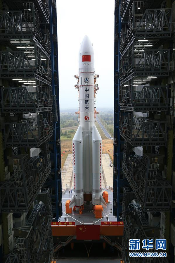 长征五号遥三运载火箭在中国文昌航天发射场完成技术区相关工作后,垂直转运至发射区(12月21日摄)。 新华社发(郭文彬 摄)
