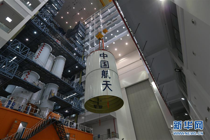 这是在厂房吊装过程中的长征五号遥三运载火箭(11月7日摄)。新华社发(屠海超 摄)