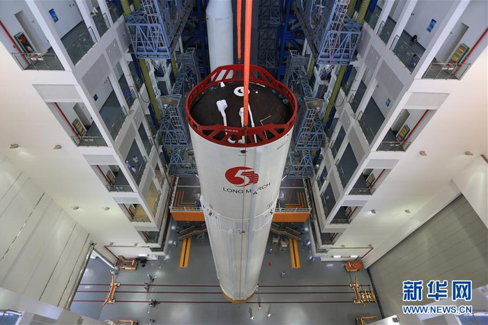 这是在厂房吊装过程中的长征五号遥三运载火箭(11月14日摄)。新华社发(屠海超 摄)