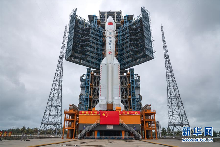 距离海边约800米的发射平台上,长征五号运载火箭白色箭体上,鲜艳的五星红旗格外醒目。有20层楼高的火箭笔直站在那里,直指苍穹。