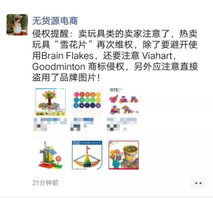 不久前,柳雯所在公司因涉嫌侵权而被关停了数家店铺。他们明显提高了警惕,多次在朋友圈发布侵权提醒。其中,最近一条为,“卖玩具类的卖家注意了,热卖玩具‘雪花片’再次维权,除了要避开使用Brain Flakes,还要注意避开商标侵权,另外应注意(不要)直接盗用品牌图片”。